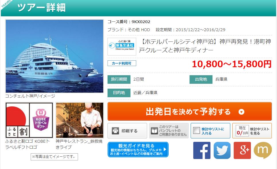 コンチェルトに乗って、神戸牛のディナーを食べて、ホテルに泊って、10,800円~です(助成金10,000円)。すごく安くないですか?ホテルは少し駅から離れているみたいですが、格安です。この旅行はこちらから