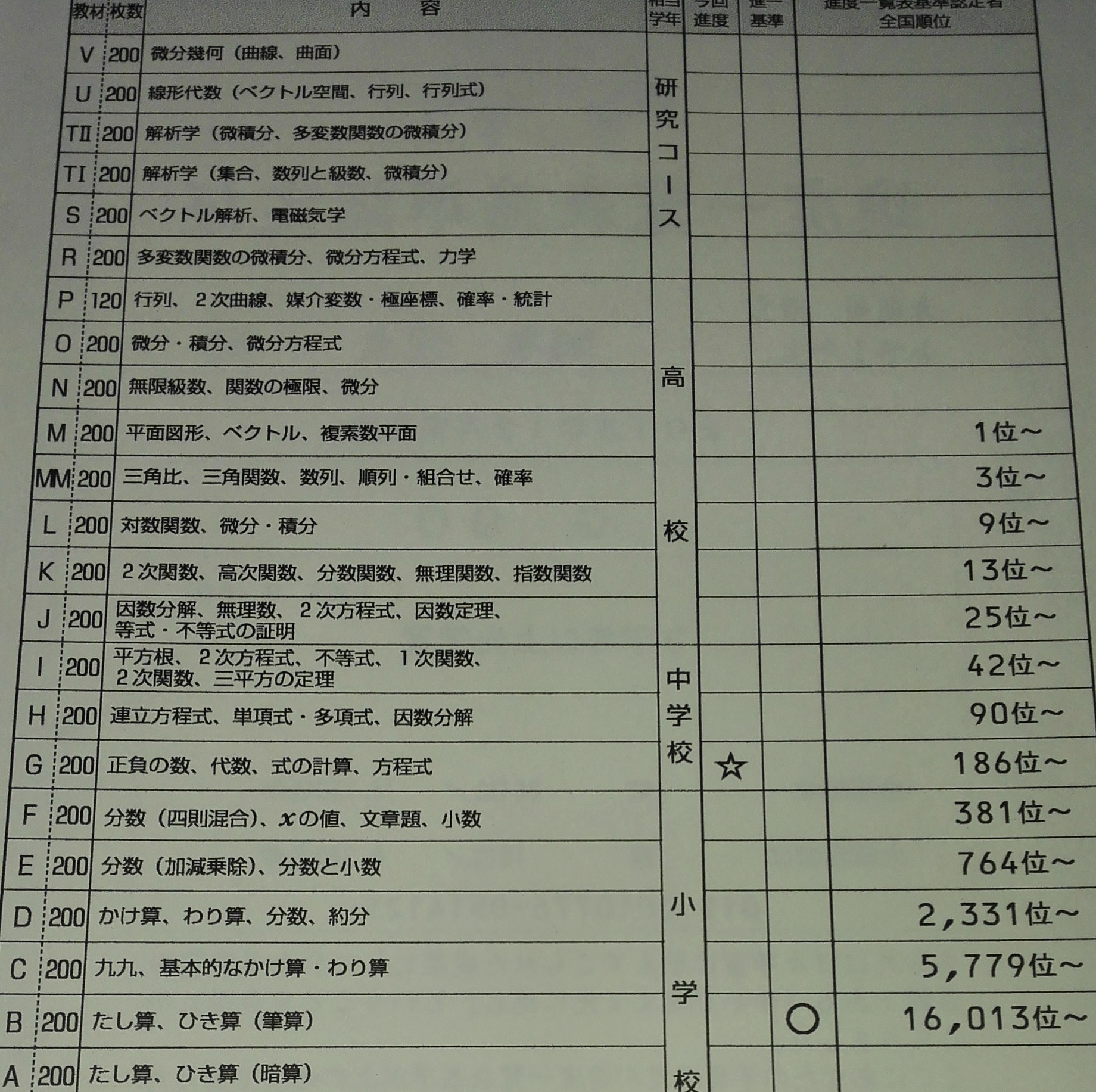 ☆が現在のポジションで○が学年相当です。1位の子は複素数平面?みたいですが、小学1年生なのにすごいですよね。こういう問題を解ける小学生は通っている小学校の授業は暇でしょうね。それか私立なのかな。