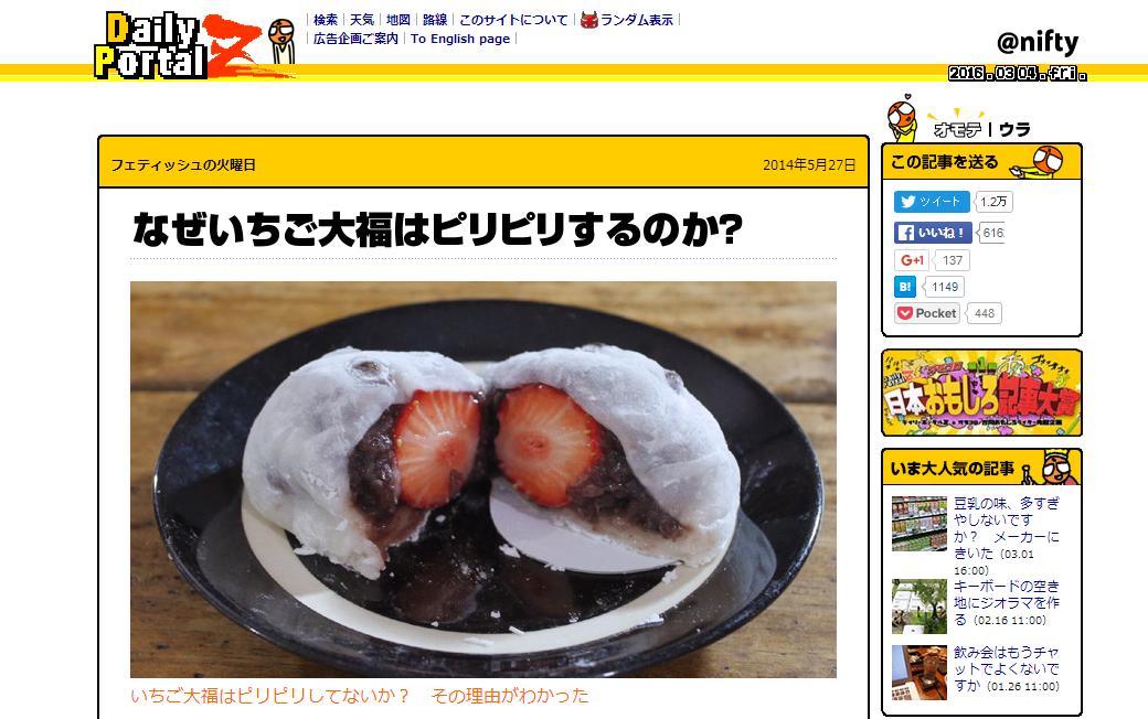 スーパーとかでもイチゴ大福は売っていますが、イチゴ大福のイチゴって何だかシュワシュワしていませんか?学生の時にローソンやセブンイレブンでアルバイトをしていて、バイトの休憩中のおやつにイチゴ大福を買ったことがあるんですが、そのイチゴ大福のイチゴがシュワシュワしていて、「ヤバいかも!?」と思った記憶があります。去年だったかな、スーパーでイチゴ大福を買った時にこのシュワシュワが気になってネットで調べてみたところ、このシュワシュワの原因はイチゴ大福のイチゴから出る炭酸ガスなんだそうです。詳しくは「なぜいちご大福はピリピリするのか?(外部サイト)」をご覧ください。誰のサイトかわかりませんが、イチゴ大福のシュワシュワの謎が書いてあります。