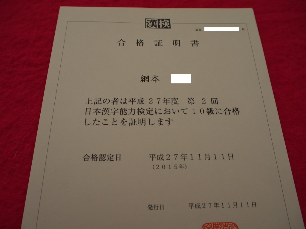息子が受験していた漢字検定10級の合格証書が届きました。10級は1年生相当の試験です。夏休みに入ってから、公文と漢字検定、算数検定の勉強をしていて「少し大変かな」と思いましたが、無事に合格できて本人も喜んでいます。