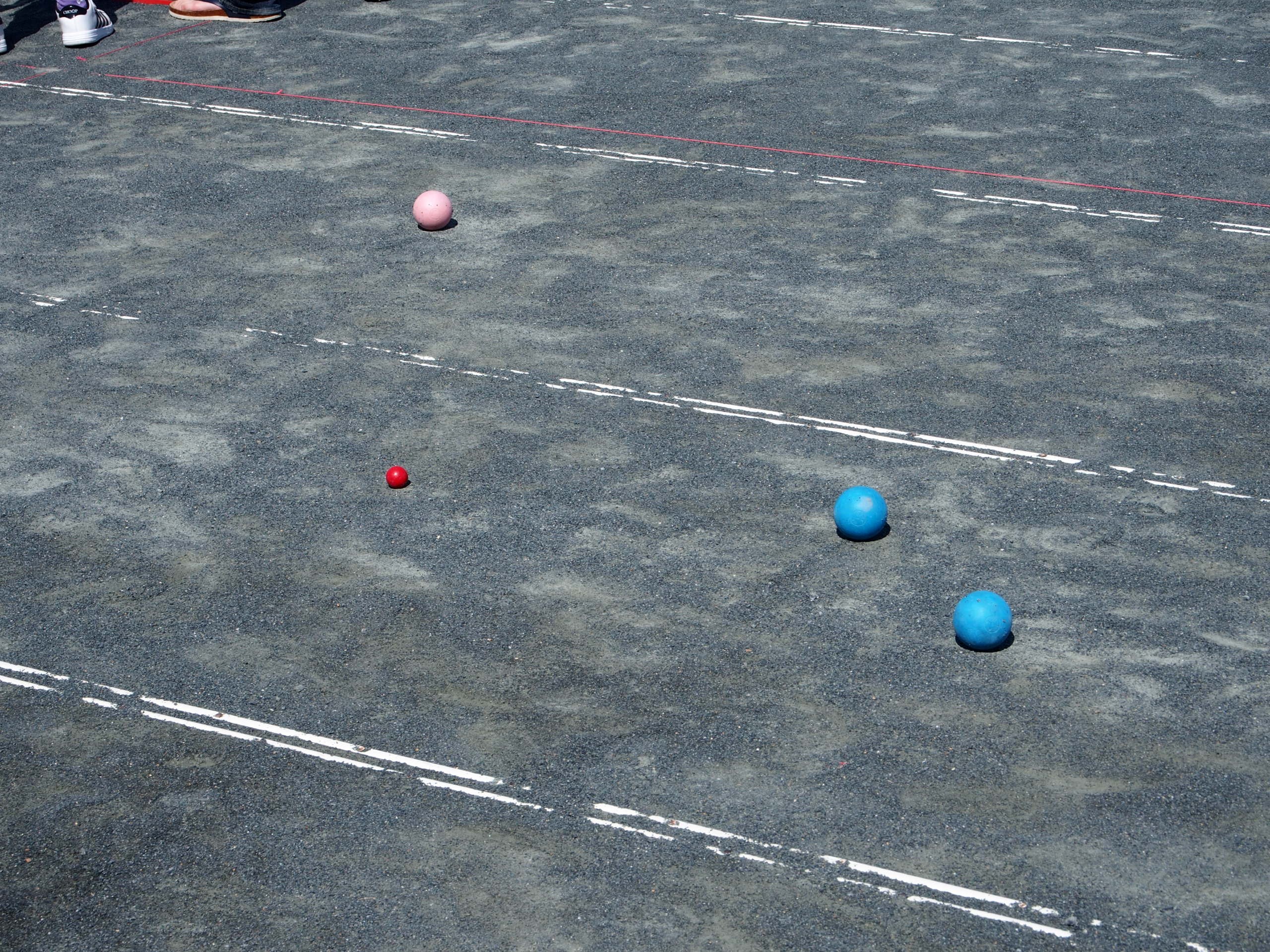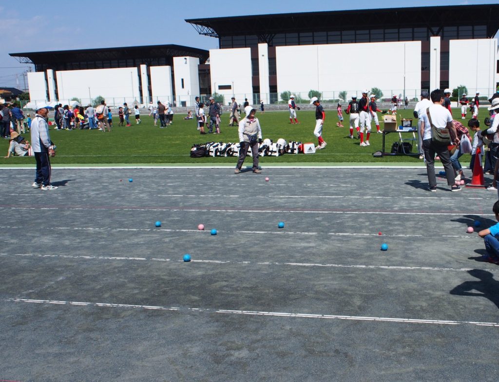 トランポリンや空手、キャッチボール、ペタンクなど様々な競技がありました。息子は「ペタンクがしたい!」とずっと言っていて、今日はペタンク目的で来ました。下の写真がペタンクという競技です。