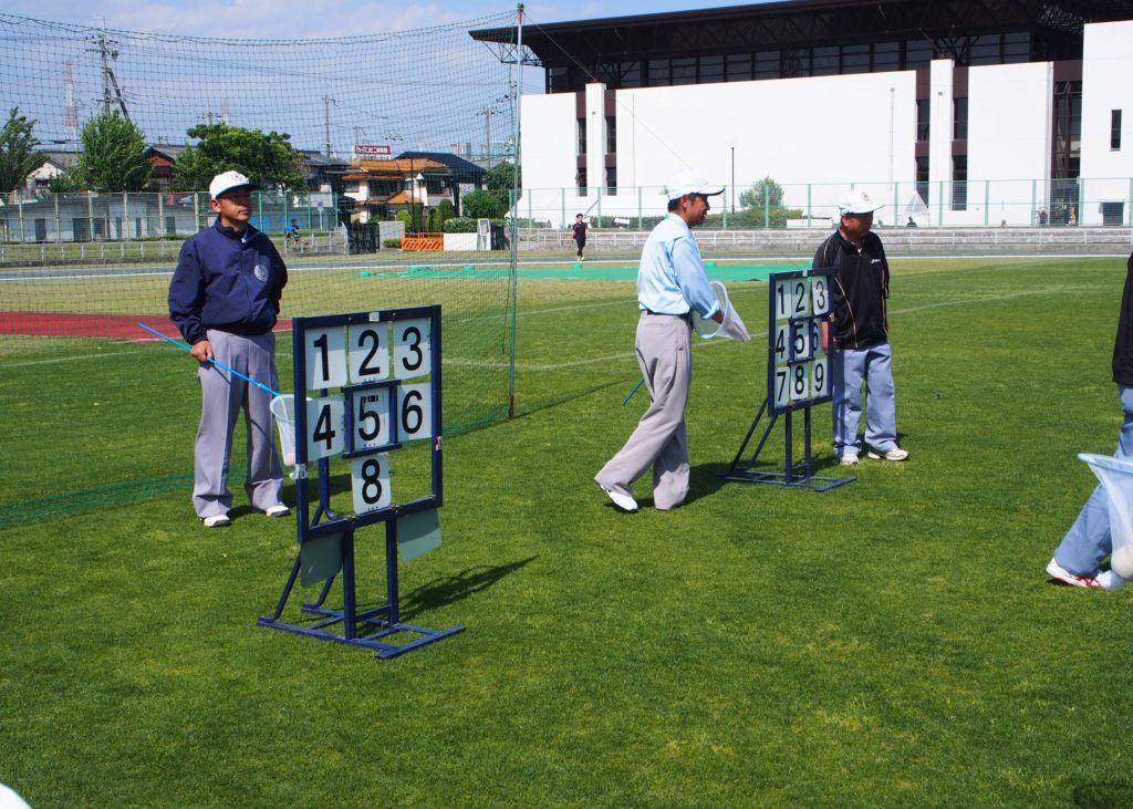 赤い玉に向けてボールを一番近く投げた人が勝ちです。初めてやりましたが結構難しいんです。