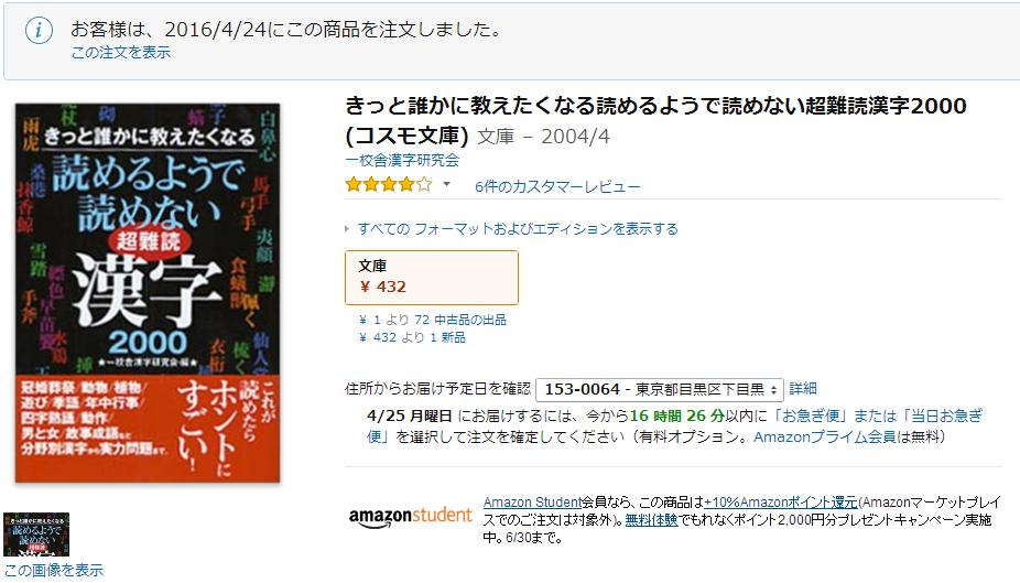 先日「きっと誰かに教えたくなる読めるようで読めない漢字2500」を買いましたが、超難読の本は図書館の返却期限がきてしまい、息子がやっぱりこの本を手元に欲しいというので買う事にしました。まぁ大した金額じゃないですしね。